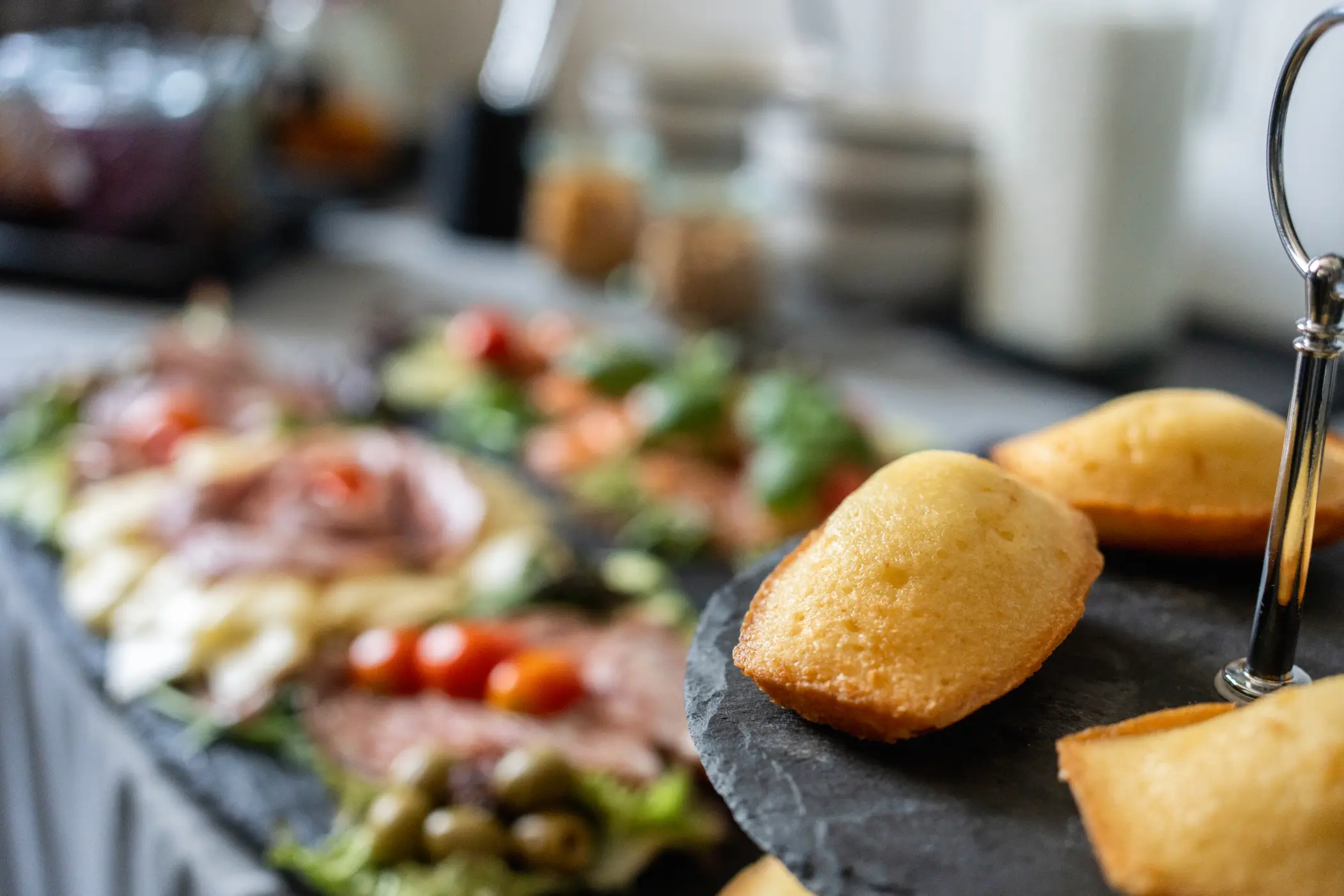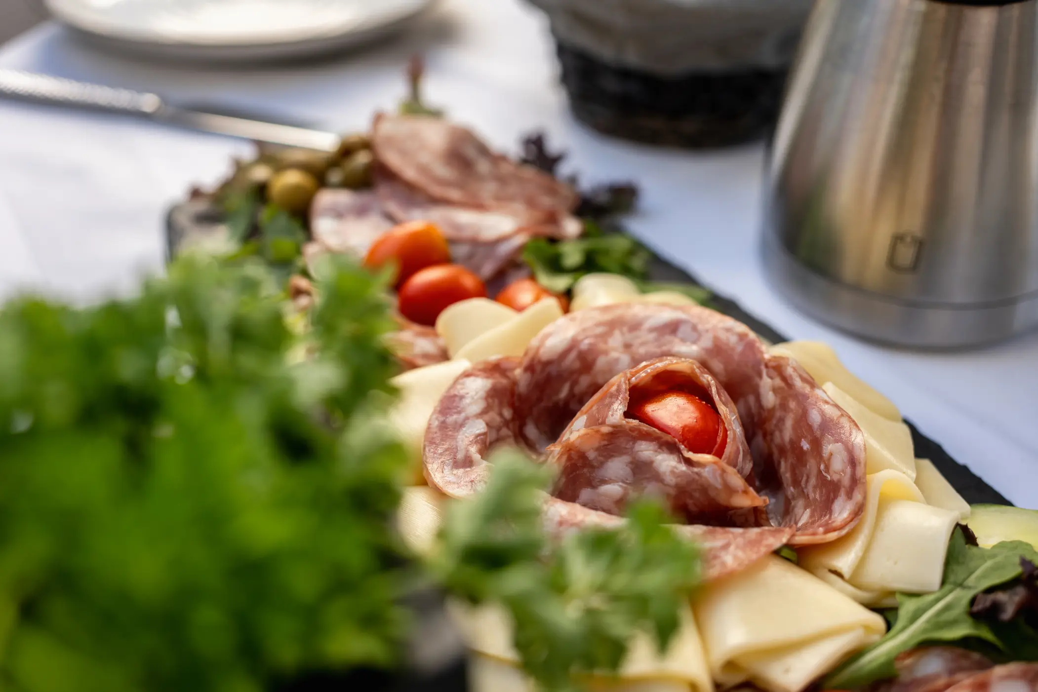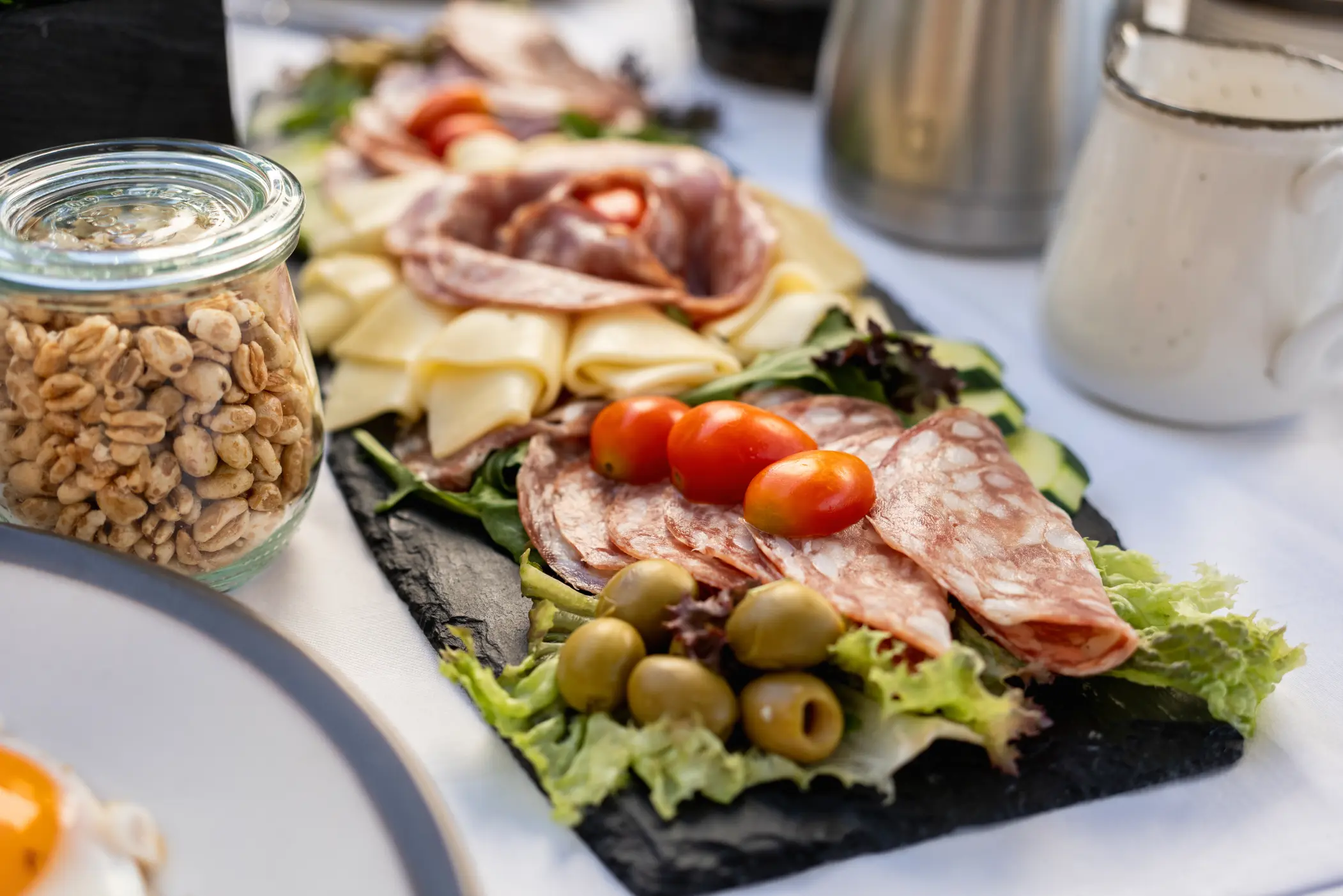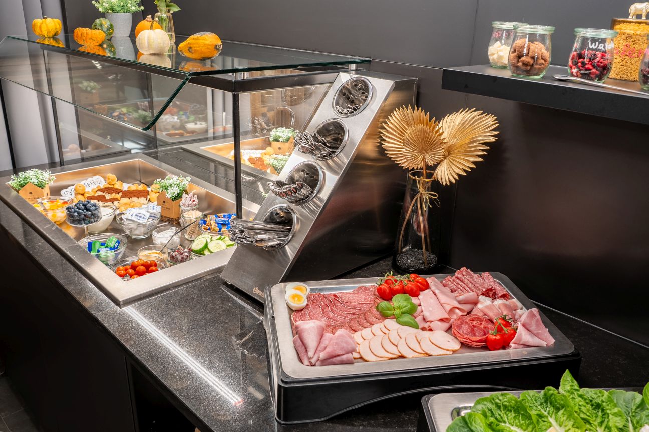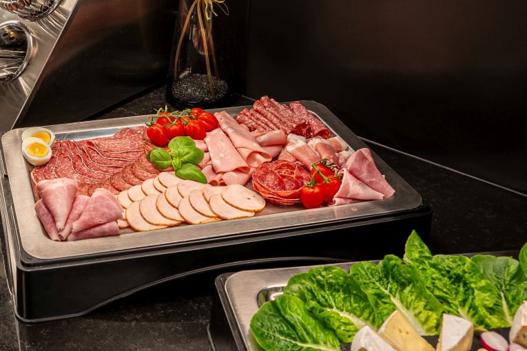 Liebhaber des herzhaften Frühstücks finden eine liebevoll zusammengestellte Aufschnitt- und Käseauswahl gekrönt von knackfrischem Knabbergemüse.